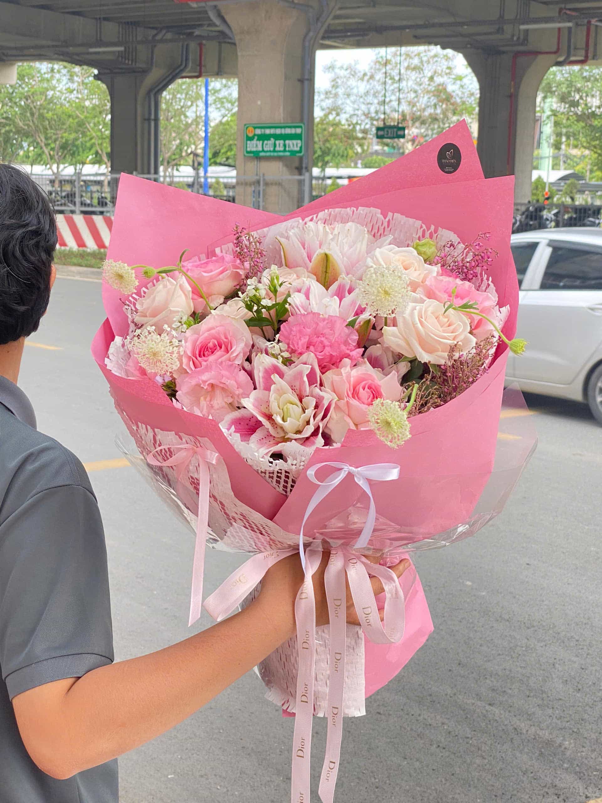 Bó hoa mang tông hồng pastel dịu nhẹ pha sắc trắng tinh khôi, thể hiện sự thanh lịch và hiện đại. Giấy gói hồng phối ruy băng Dior sang trọng tạo điểm nhấn cao cấp, phù hợp với nhiều dịp tặng hoa khác nhau.