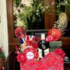Tone đỏ nổi bật cùng phụ kiện trang trí Tết truyền thống giúp giỏ quà trở thành món quà mang ý nghĩa hỷ sự – thịnh vượng – khai lộc đầu xuân.