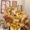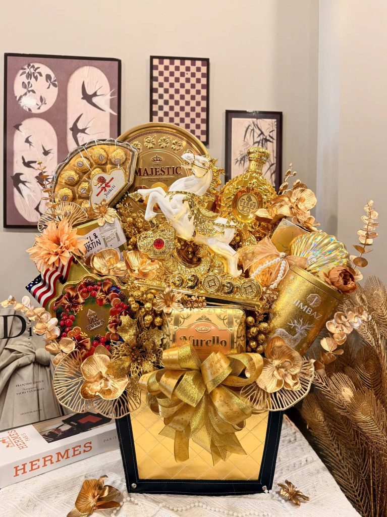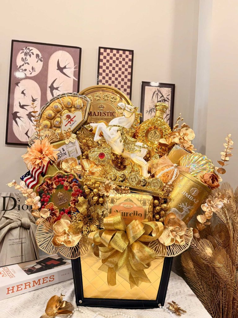 Toàn bộ sản phẩm đều là hàng cao cấp, được phối trong hộp tone vàng sang trọng, điểm nhấn hoa kim tuyến và phụ kiện ánh kim, giúp giỏ quà trở thành tâm điểm trong mọi buổi trao tặng.