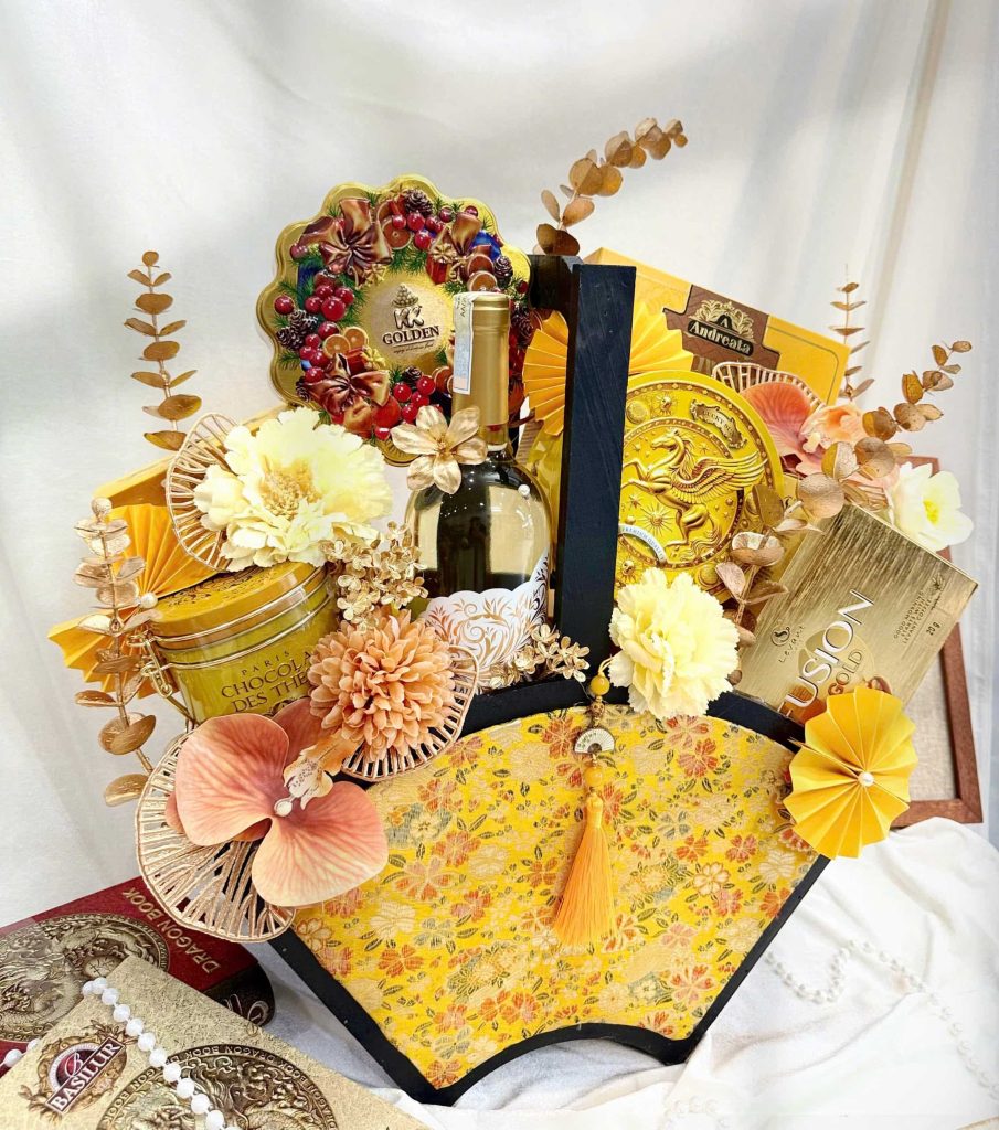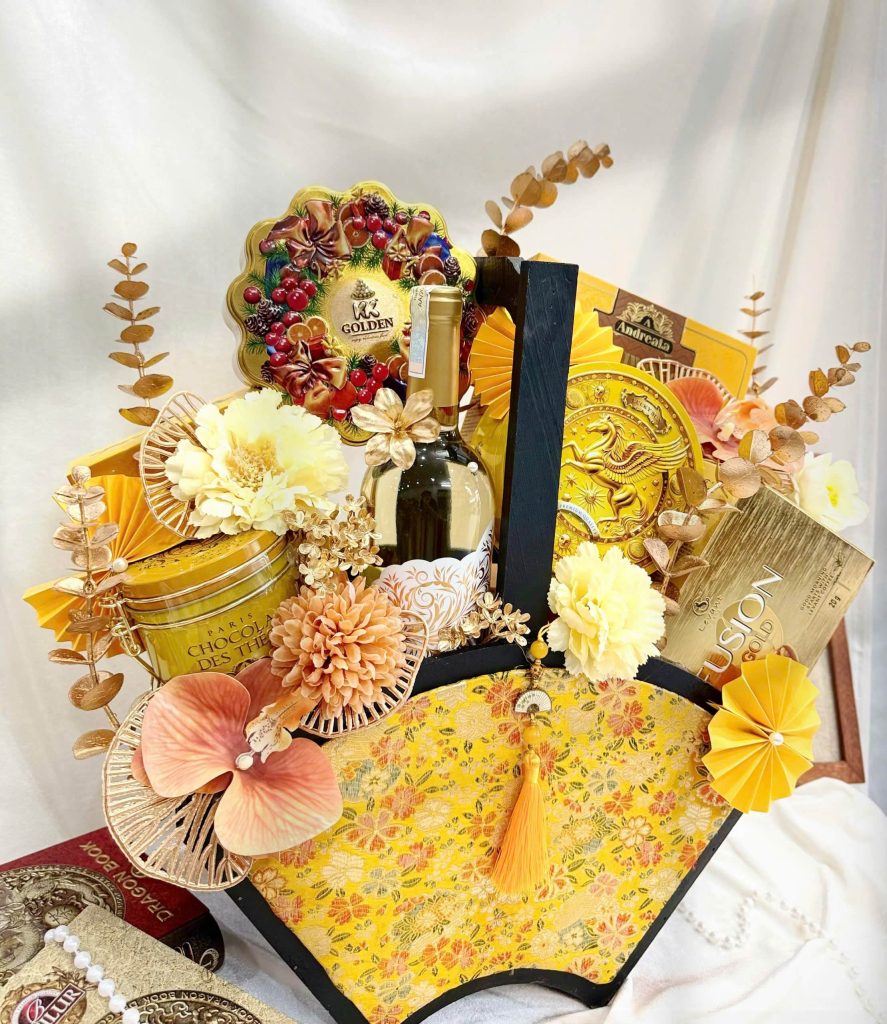 Giỏ được phối nghệ thuật với sắc vàng – cam nồng ấm, kết hợp cùng rượu vang nhập khẩu và các sản phẩm cao cấp đến từ nhiều thương hiệu quốc tế. Đây là món quà hoàn hảo để tặng đối tác, khách hàng thân thiết hoặc người thân trong dịp Tết Nguyên Đán.