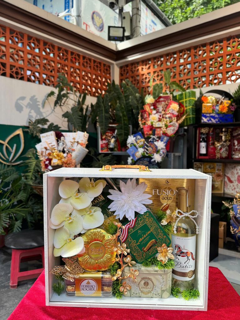 TDF79 là mẫu giỏ quà Tết doanh nghiệp cao cấp thiết kế dạng vali gỗ trắng, phối hoa lan và hoa lụa tone kem – vàng sang trọng, tạo cảm giác tinh tế, đẳng cấp và chỉn chu. Bố cục mở rõ ràng, sản phẩm được sắp xếp cân đối, phù hợp làm quà Tết biếu đối tác quan trọng, khách hàng VIP hoặc quà tri ân doanh nghiệp dịp cuối năm.