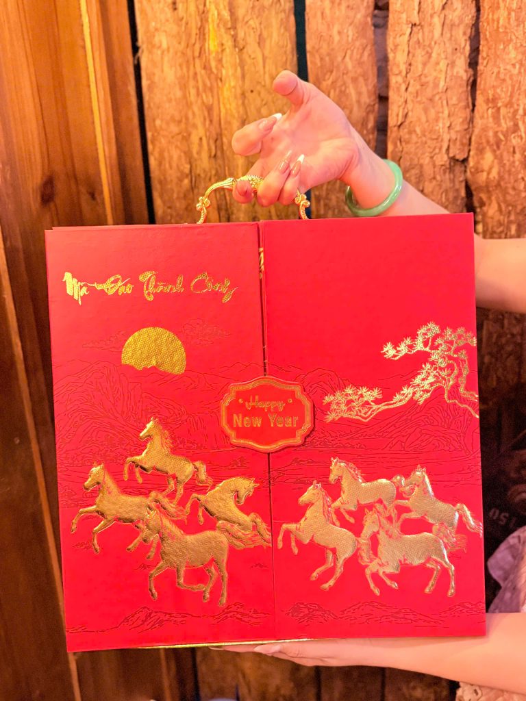 Thiết kế hộp đỏ ánh kim sang trọng, biểu tượng mùa xuân – cực phù hợp tặng doanh nghiệp.