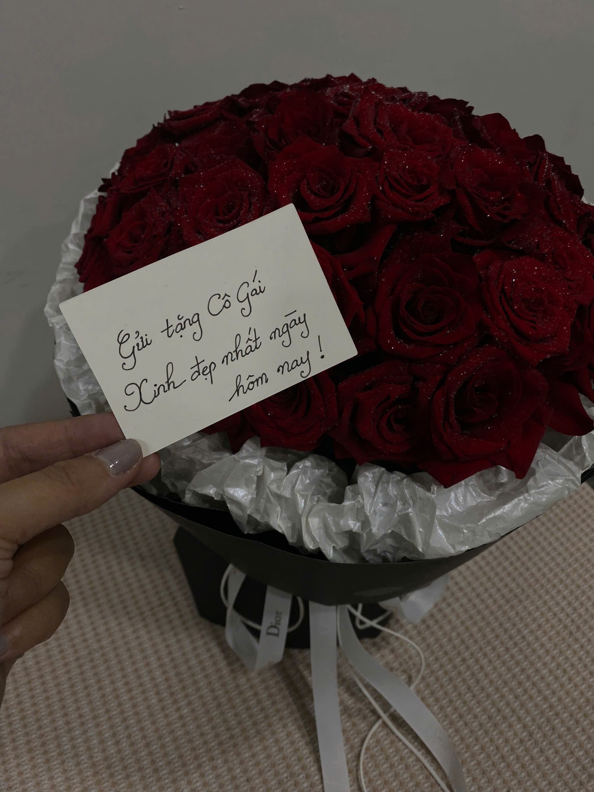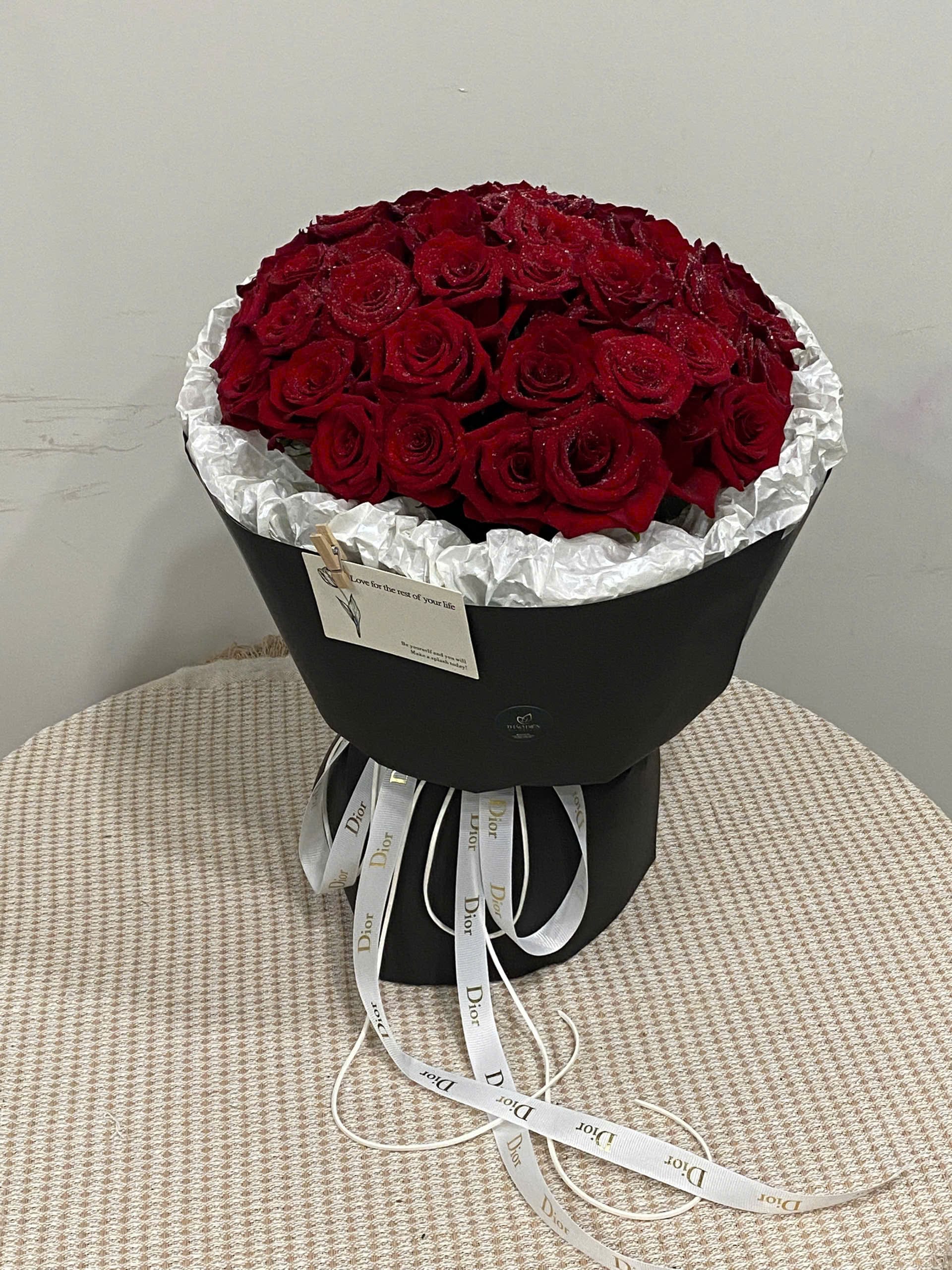 Tông đỏ thẫm của hoa được làm nổi bật bởi giấy gói đen cao cấp và lớp lót trắng tinh khôi, tạo sự đối lập ấn tượng và sang trọng. Ruy băng trắng in thương hiệu Dior giúp bó hoa thêm phần đẳng cấp và thời thượng.