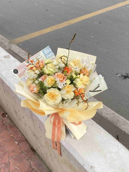 Bó hoa sử dụng tone vàng nhạt – cam pastel – trắng, tượng trưng cho sự tươi vui, khởi đầu mới và sự may mắn. Đây là màu sắc hoàn hảo cho những dịp chúc mừng, khích lệ và tri ân.