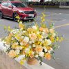 Tông vàng – cam – trắng nổi bật, được cắm trong giỏ mây thủ công độc đáo, tạo cảm giác sang trọng nhưng gần gũi. Đây là thiết kế tươi mới và giàu sức sống, thích hợp cho không gian hiện đại.