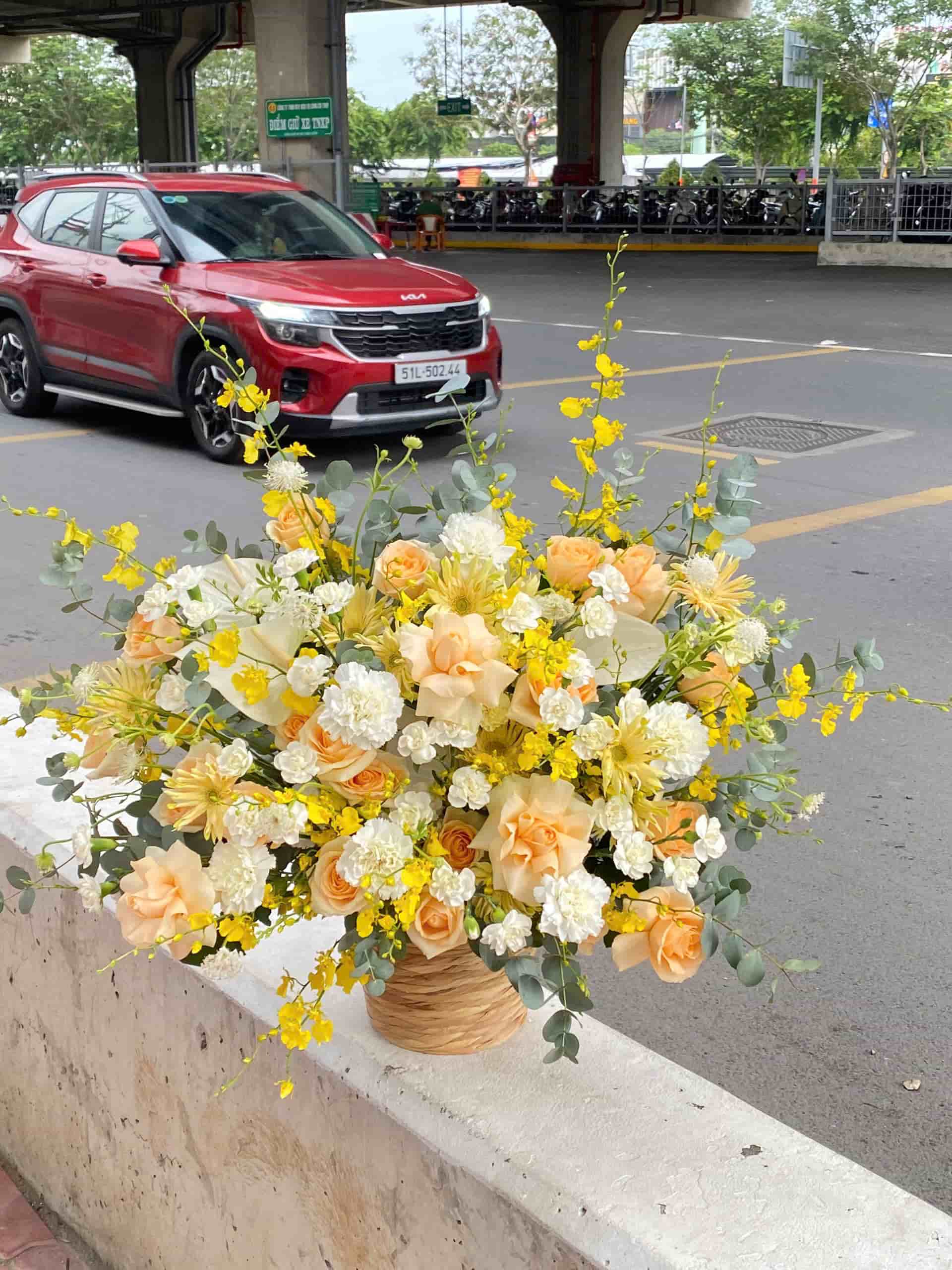 Tông vàng – cam – trắng nổi bật, được cắm trong giỏ mây thủ công độc đáo, tạo cảm giác sang trọng nhưng gần gũi. Đây là thiết kế tươi mới và giàu sức sống, thích hợp cho không gian hiện đại.