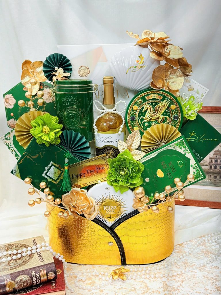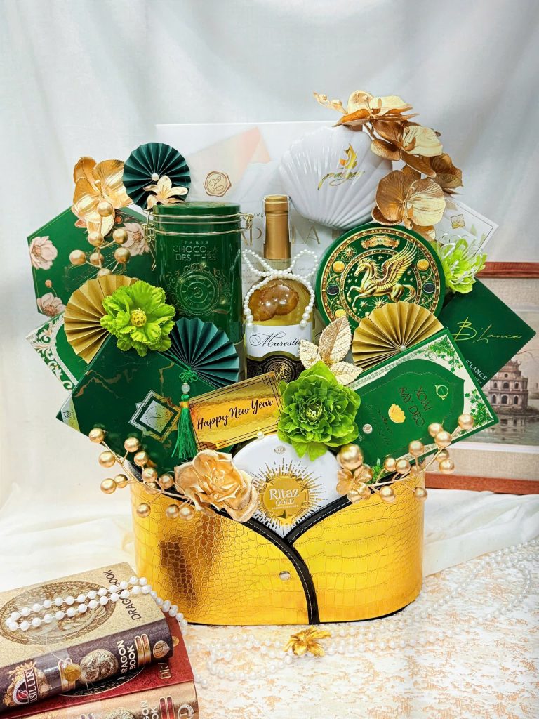 Set quà được phối trong hộp đựng vàng ánh kim sang trọng – nổi bật trong mọi không gian.