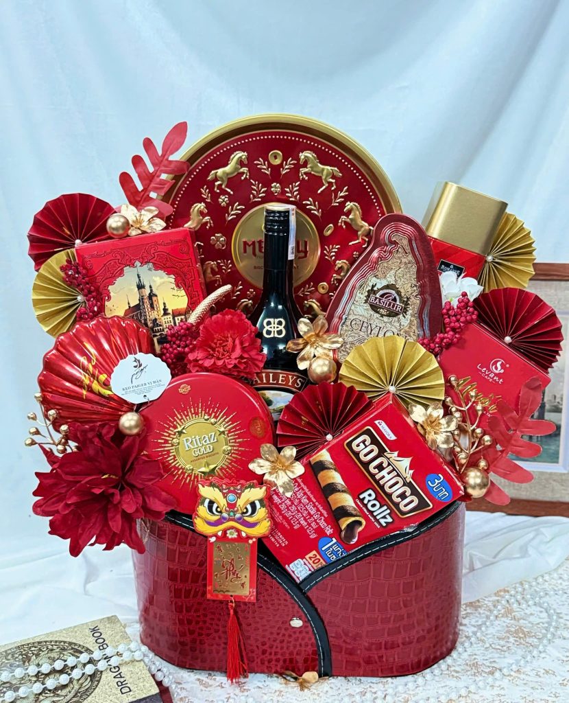 Set quà Tết TDF27 mang tone đỏ – vàng quyền lực, biểu tượng cho may mắn – sung túc – tài lộc dồi dào trong năm mới. Với điểm nhấn là rượu Baileys cao cấp, kết hợp cùng bánh – kẹo – trà – cà phê nhập khẩu, TDF27 trở thành lựa chọn lý tưởng cho doanh nghiệp biếu tặng đối tác, khách VIP hoặc tặng gia đình.