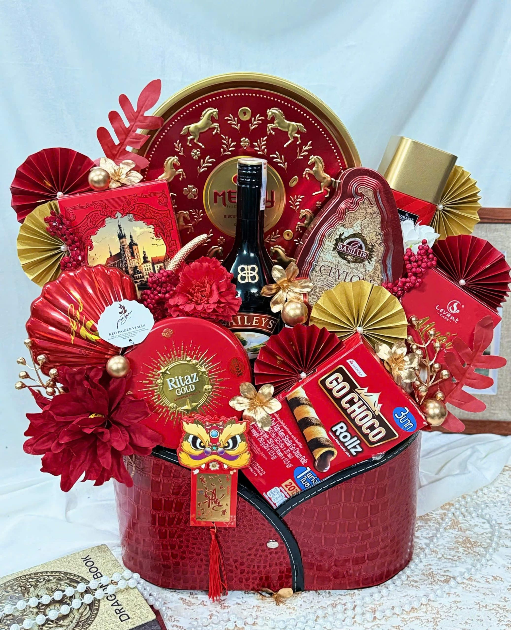 Set quà Tết TDF27 mang tone đỏ – vàng quyền lực, biểu tượng cho may mắn – sung túc – tài lộc dồi dào trong năm mới. Với điểm nhấn là rượu Baileys cao cấp, kết hợp cùng bánh – kẹo – trà – cà phê nhập khẩu, TDF27 trở thành lựa chọn lý tưởng cho doanh nghiệp biếu tặng đối tác, khách VIP hoặc tặng gia đình.