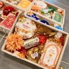Sản phẩm bên trong đầy đủ: bánh – trái cây sấy – socola – thức uống nhẹ.